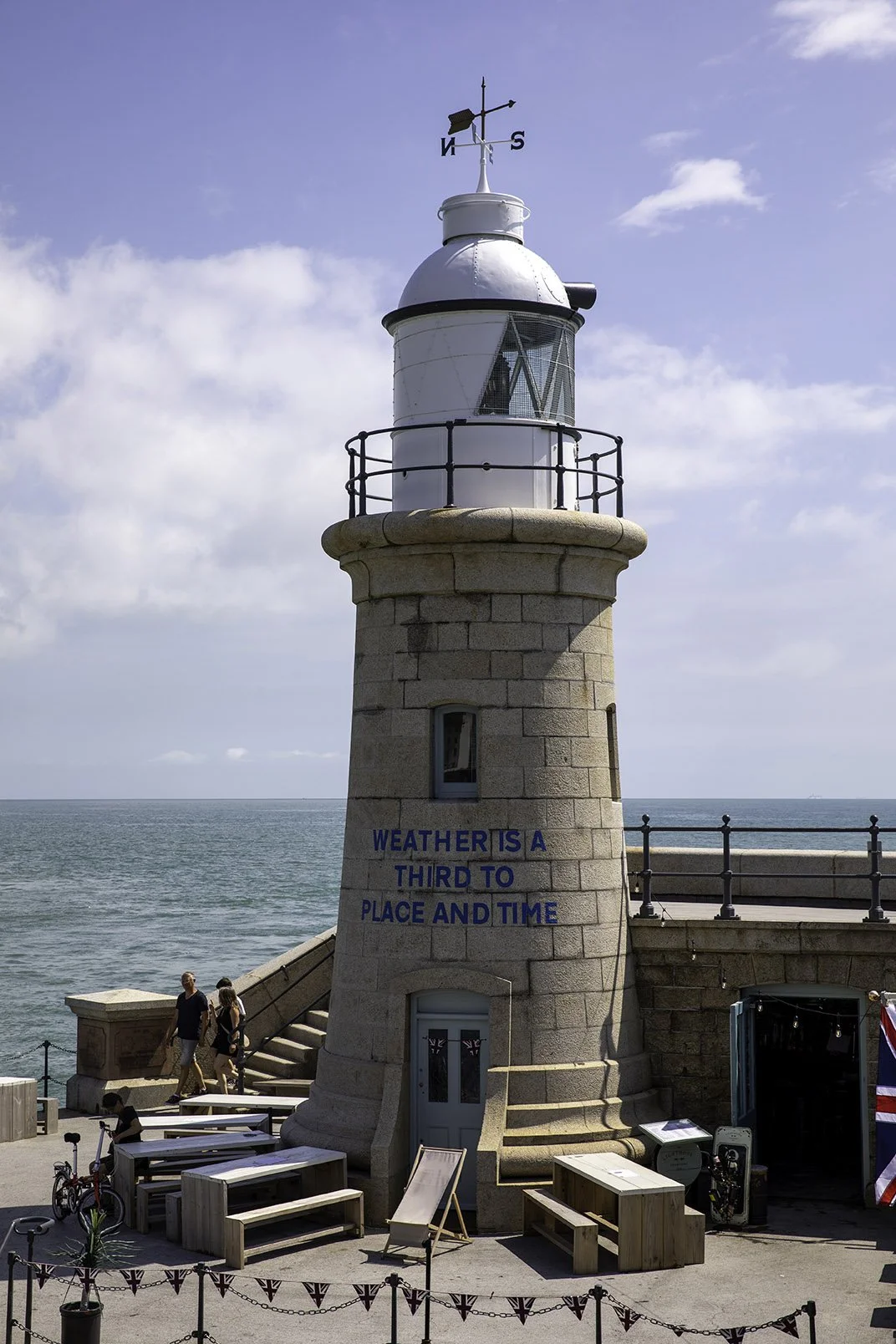 Moving along the Harbour Arm which juts out into the sea and protects the harbour, I walked along the top level and came to the Harbour Arm Lighthouse at the end of the pier. On it has been painted in blue block letters the text WEATHER IS A THIRD TO PLACE AND TIME. This mural has been created using a phrase from a poem by the late artist-poet Ian Hamilton Finlay.