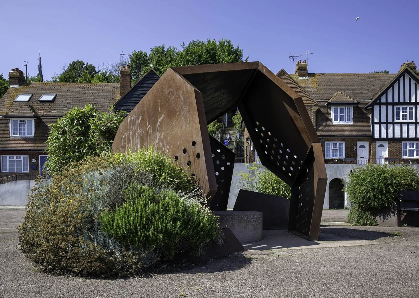 Walking on towards Sunny Sands beach I came upon a metal pavilion called Steve. Yes, that is the title of this installation by sculptor Sarah Staton. This was a slow burner for me. Although I liked the chunkiness and the rusty colour of it instantly, I was too busy paying attention to a piece that was part of the current triennial to give it proper attention. It was only really when I looked at the photo and I saw it with new eyes that I loved how practical it is. It’s not just an artistic structure, it’s a pavilion with a seating area inside and plants around it. It’s the perfect place to shelter from too much sun or rain. I looked it up online and the artist said she created it as a people friendly sculpture. It was originally commissioned for the Folkestone Triennial 2014. It’s reminiscent of the work of Richard Serra (the vast sheets of vertical steel slabs titled Fulcrum at Liverpool Street Station in London) but to my mind has more beauty in it. I like that it’s both beautiful and useful. It fits in well colourwise with the bricks and roof tiles of the houses behind.