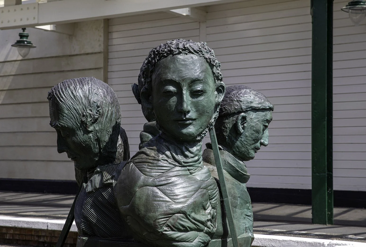 This bronze sculpture is titled Rug People and the artist is Paloma Varga Weisz. There are five heads all facing outwards from a central point. The artist said she thought about the range of emotions of passengers using the station in the past. Soldiers embarking to fight in the First World War, being fearful that they’d never return, refugees arriving from Europe or passengers excited to travel on the Orient Express from this terminal.