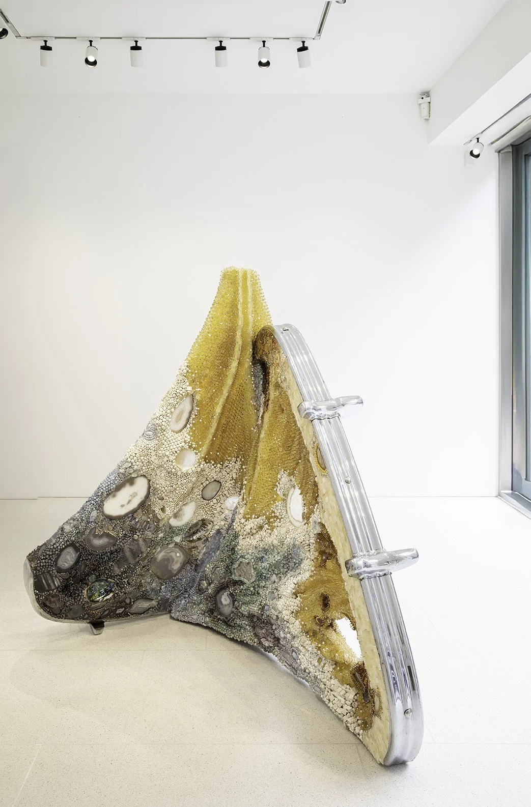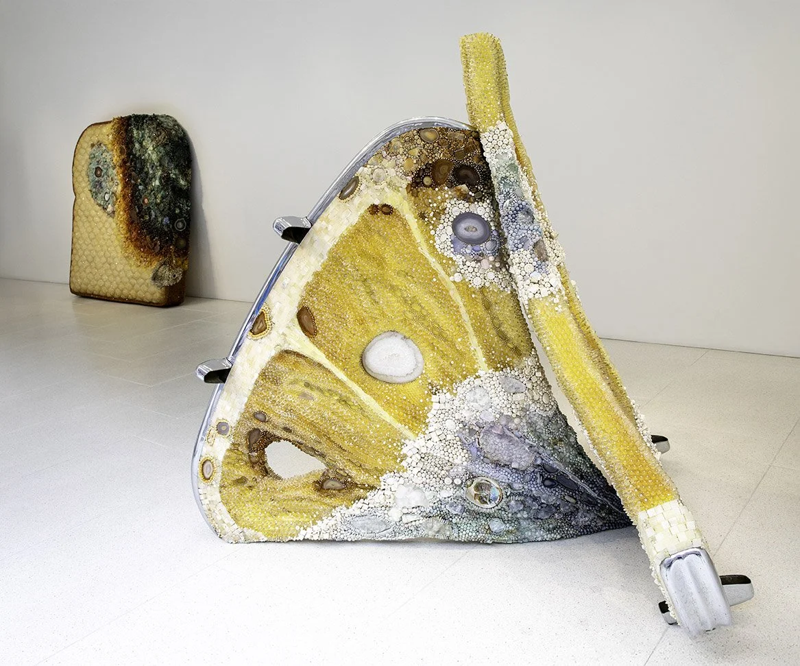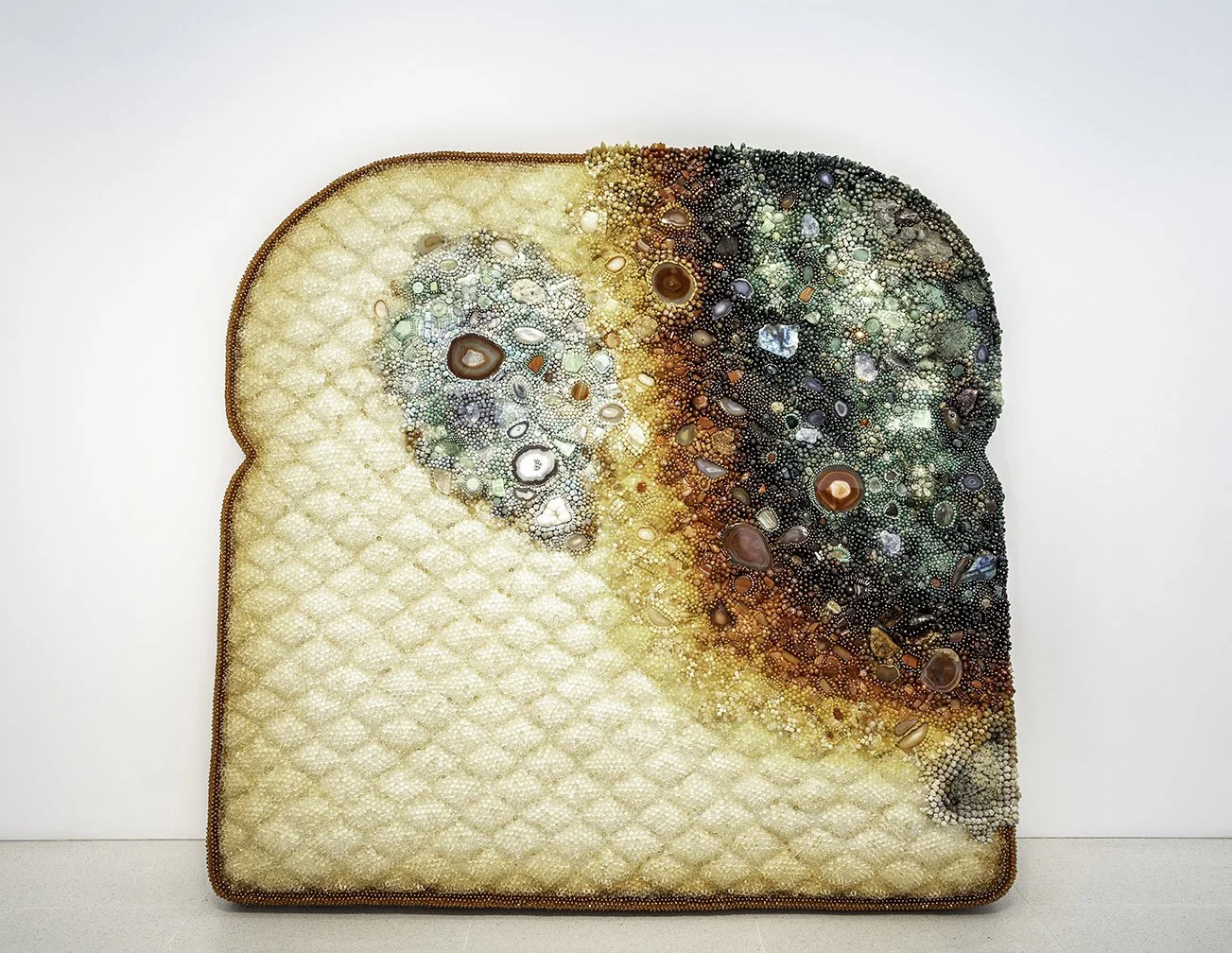 One is titled Sliced Bread (Golden Hour) and it depicts a mouldy slice of bread. I’m going to write the full list of materials here (as quoted in the exhibition printed hand out). Not because I think you’ll want to read the entire list but just because it’s astonishing to see the level of detail and amount of beads, stones and semi-precious stones which were used. When you see that a king sized mattress is the base of this, you’ll be able to envisage the size of it.