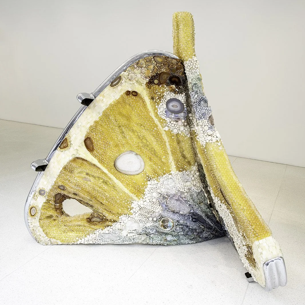The second piece depicts two mouldy slices of lemon. This time the base of the piece is polystyrene and it’s topped with chrome fenders.